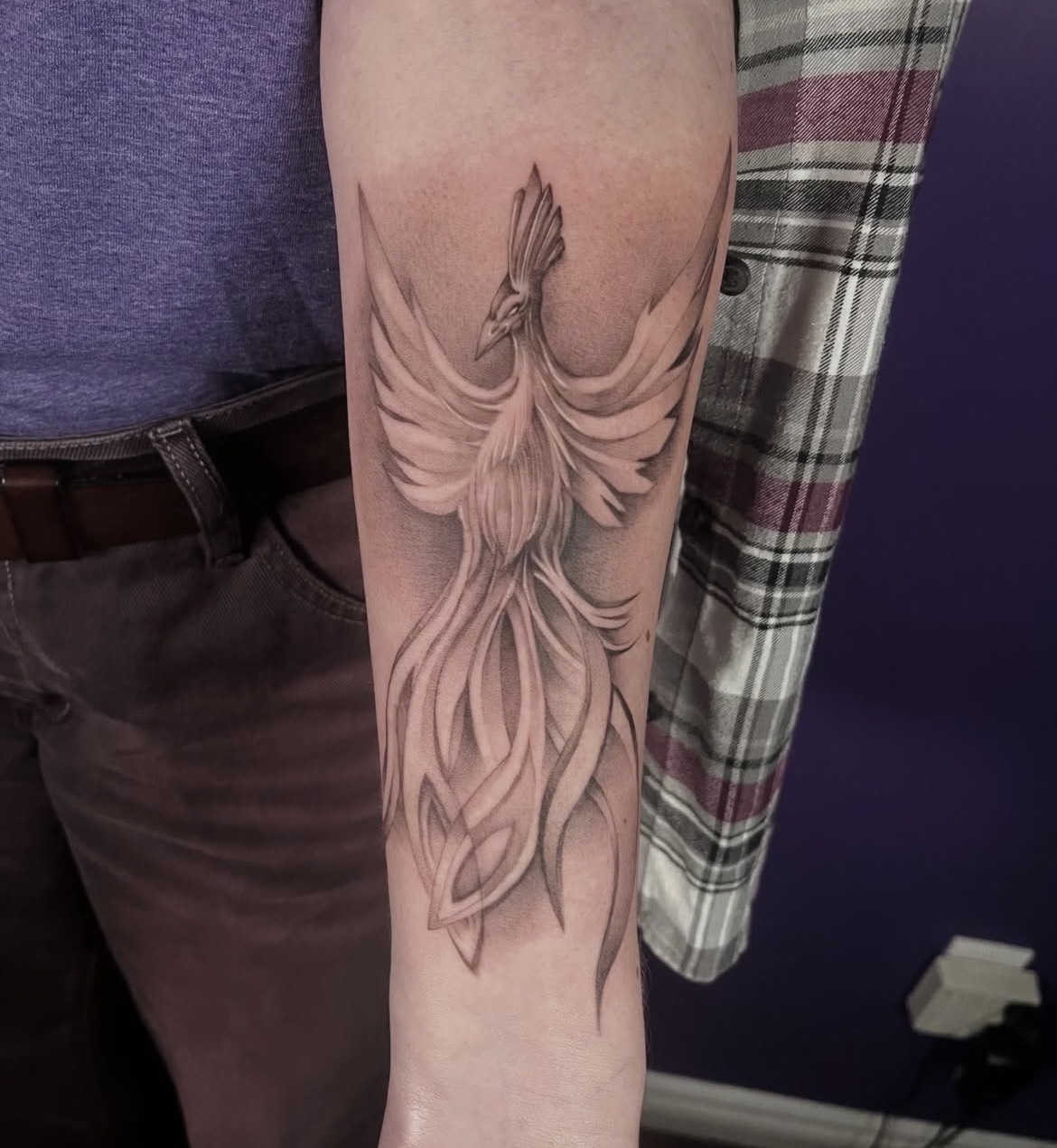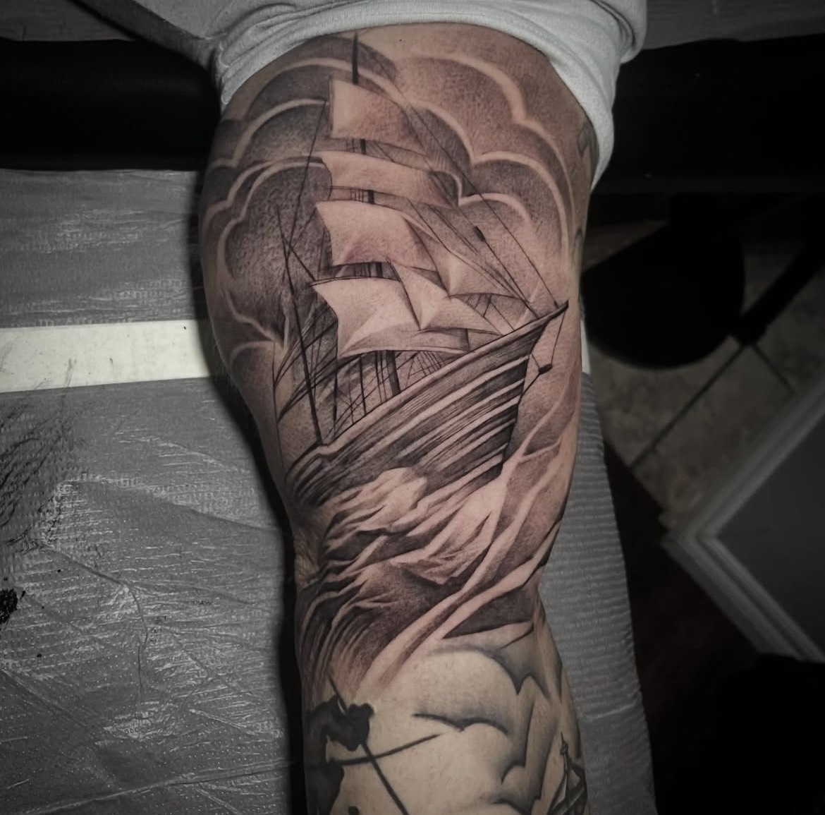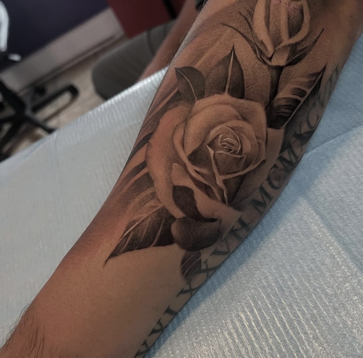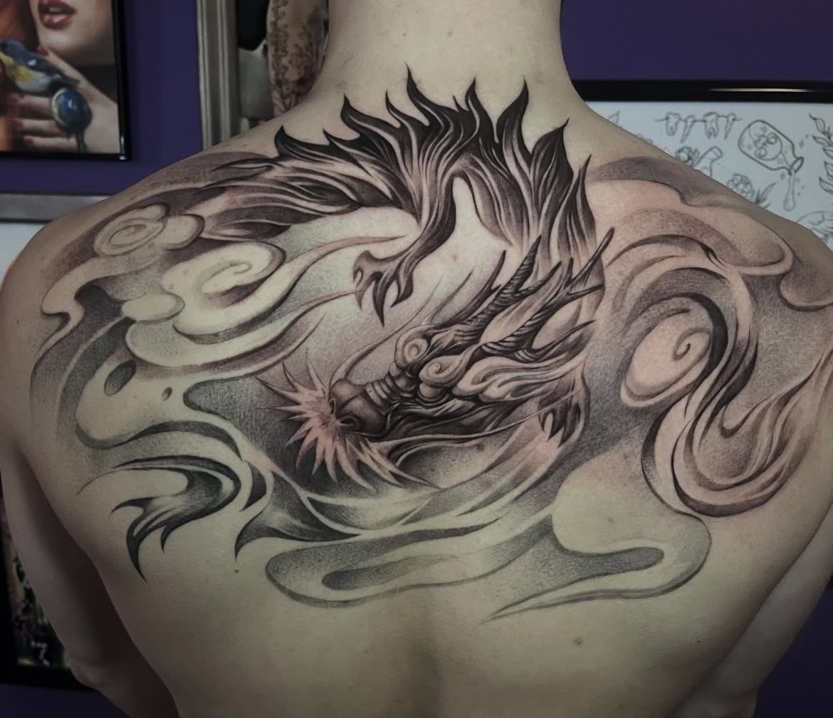 I love free handing stuff, which means using a marker to draw directly on the skin as the stencil, because it goes well with the flow of the body. For styles, I enjoy doing black and grey realism tattoos with a touch of abstract or even oriental vibe.